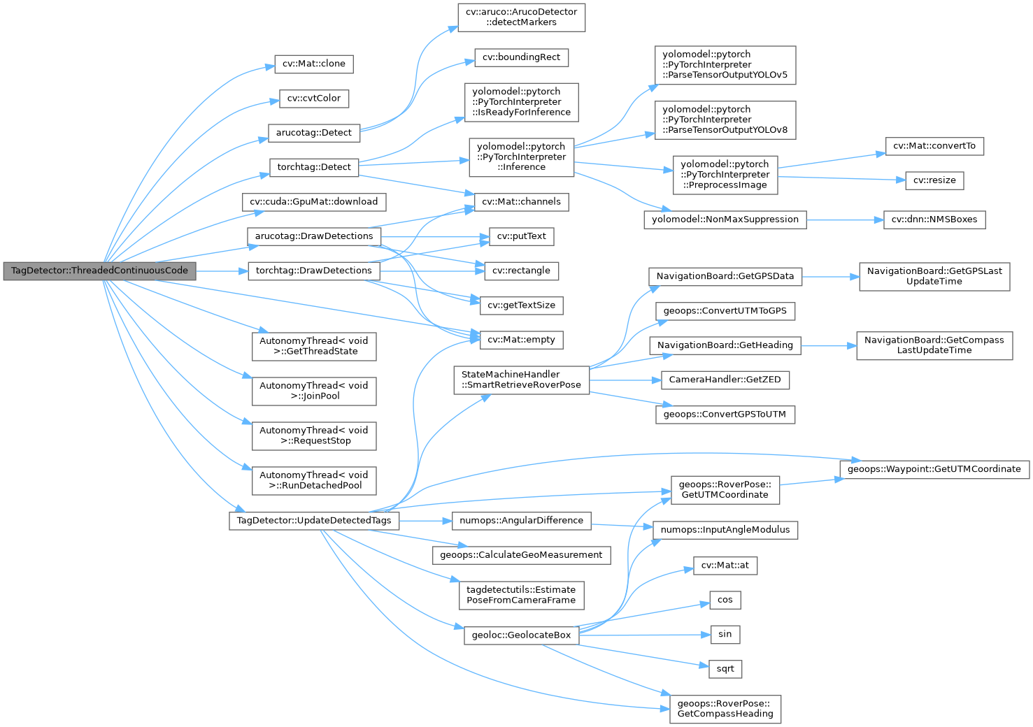 What are the threads doing? Continuous Thread: In this thread we are constantly getting images and depth maps from the necessary cameras. We then detect the tags in the image and estimate their location with respect to the rover. Pooled Threads: Copy the vector of detected tags to all of the threads requesting it through the RequestDetectedArucoTags(...) function.
