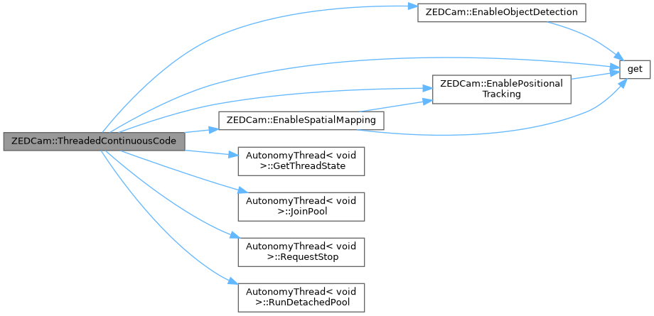 The code inside this private method runs in a separate thread, but still has access to this*. This method continuously calls the grab() function of the ZEDSDK, which updates all frames (RGB, depth, cloud) and all other data such as positional and spatial mapping. Then a thread pool is started and joined once per iteration to mass copy the frames and/or measure to any other thread waiting in the queues.